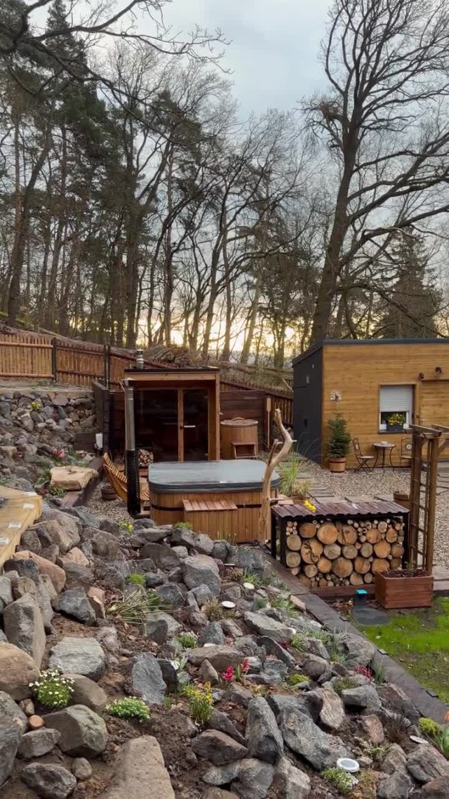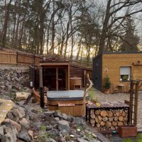 Romantické wellness pod širým nebem vás okouzlí horkou koupelí v dřevěné vířivé kádi s 18 masážními tryskami, vůní lesa a pohledem na hvězdnou oblohu. Zahřejte se v sauně, relaxujte u praskajícího ohně a nechte každodenní starosti daleko za sebou.