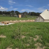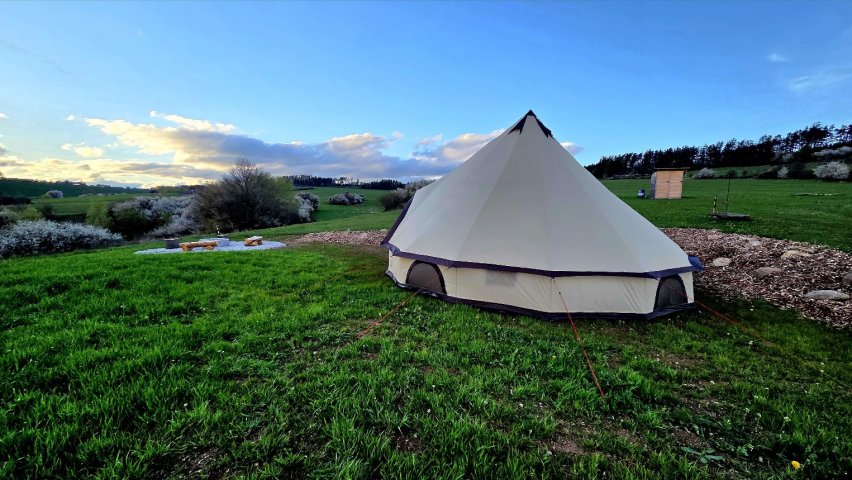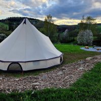 Příjezdová cesta je zpevněná, dále po trávě lze autem parkovat naproti Glampingovému stanu nebo jej můžete ponechat dole na pozemku. Problém vyjet až na horu může být na sněhu nebo po dešti. Za bránou tedy raději za mokra nezastavujte a spíš to trochu rozjeďte už od silnice. Jinak za sucha obvykle bez problémů. Vjezd je dostatečně široký pro karavany i auta s obytným přívěsem, stačí opatrně zvednout bránu! **Bránu přidržujte celou dobu manipulace za kládu, nikoliv za závaží. Jinak hrozí vylomení sloupků!**
